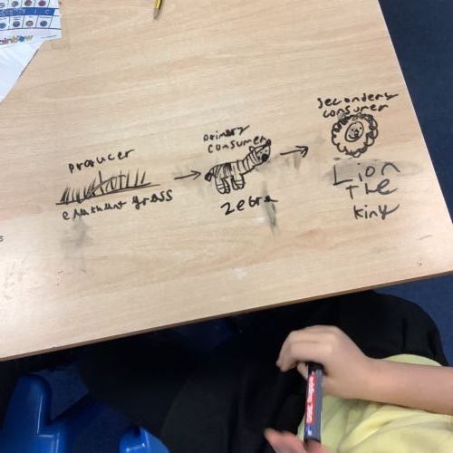 We discussed what a food chain is and vocabulary such as producer, consumer and predator. The children then drew a food chain based on the animals in Africa.