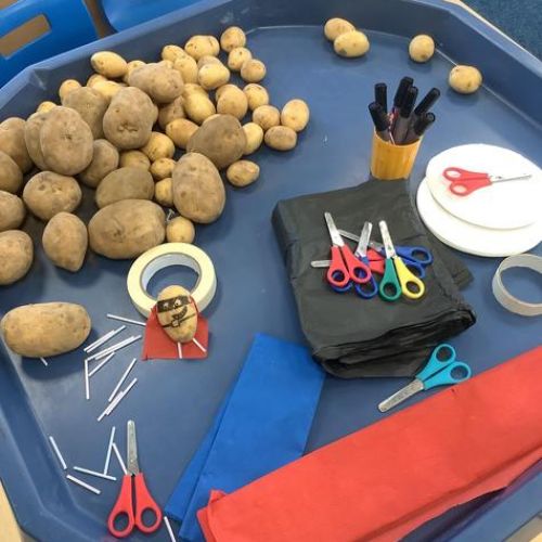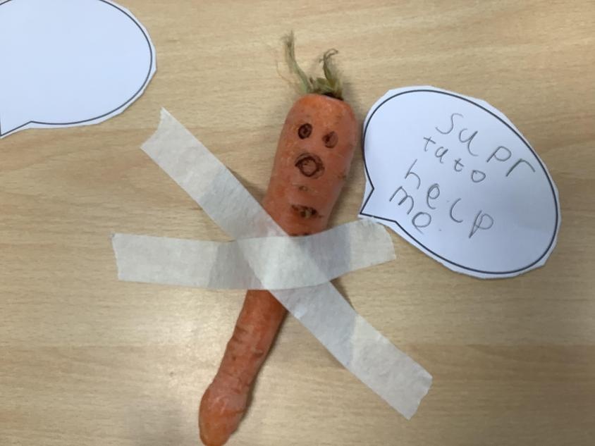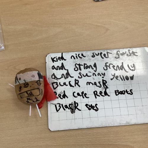 In English we have been enjoying the story ‘Supertato’ and coming up with exciting adjectives to describe him. We produced some wonderful pieces of writing! The evil pea also taped some carrots to the tables so we wrote speech bubbles and at playtime Supertato came to rescue the carrots…hooray! We also had fun designing and making our very own Supertato.